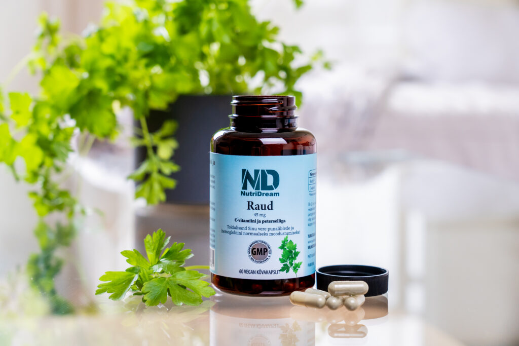 - Raud (45mg) C-vitamiini ja peterselliga – on hea imenduvusega toidulisand, mis sisaldab rauddiglütsinaati (Ferrochel™).